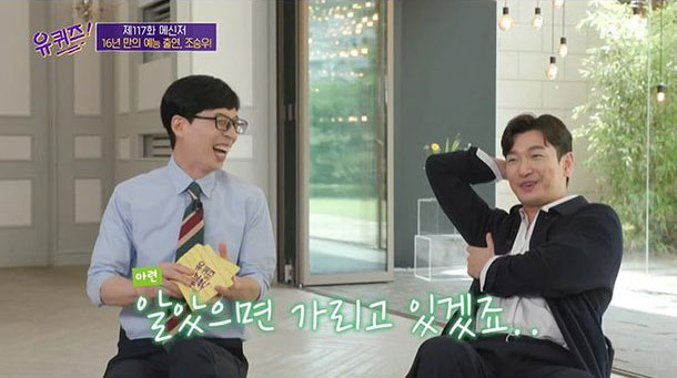 이에 유재석은 "사진 제목이 뭐라고 생각하세요? 평생 고생할 조승우입니다." 라고 말했지만 조승우는 "가장 좋아하는 사진이다." 라고 말했습니다.