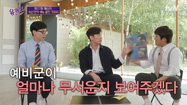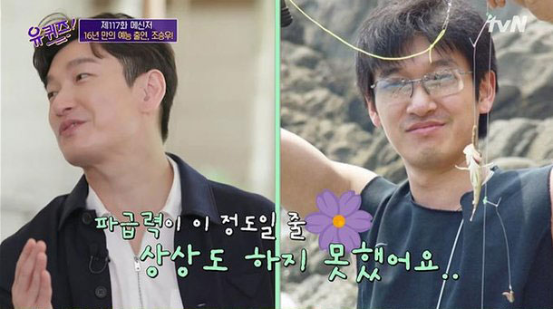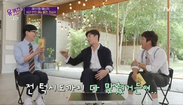 이날 진행자 유재석은 "조승우는 짤부자다"고 조승우에게 말했고 진행자 조세호는 배우 지진희, 황정민과 함께한 조승우의 사진을 공개했습니다.